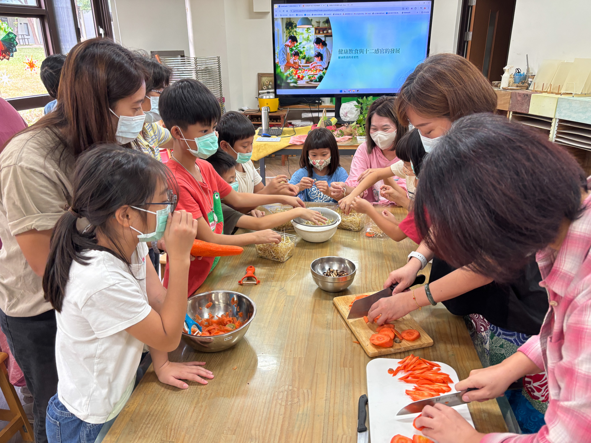 Parents began by recalling the most joyful meal they had ever experienced, expressing the emotions through color. They then moved into hands-on activities selecting vegetables, cooking, seasoning, and creating a welcoming table atmosphere. Children and parents chopped carrots, peeled corn, picked bean sprouts, stir-fried vegetables, cooked soup, and set the table together. When children who were usually picky eaters began eagerly eating green peppers and carrots, the parents were pleasantly surprised.