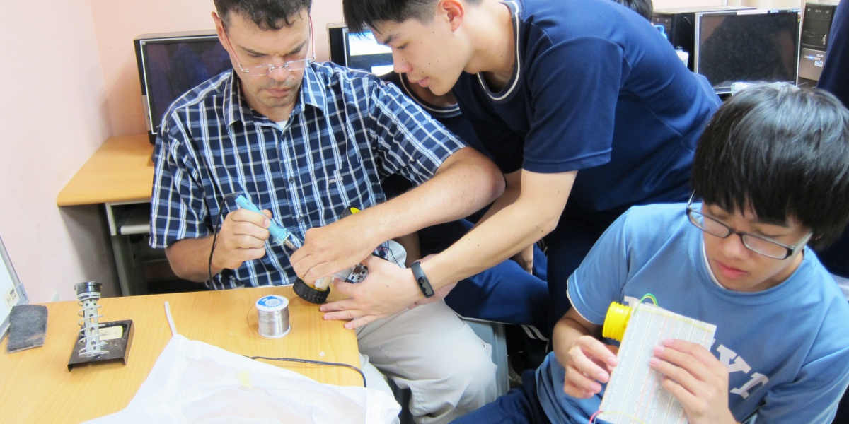 「機器人與程式設計社」由外籍教師Frank Gibson擔任指導老師,他向台東大學商借程式電路板,規劃自走車課程,教學結合程式語言學習和實做,讓同學透過操作自走車學習硬體和軟體的應用,培養運算思維能力。社團同學回饋:學習程式設計最大的收穫除了知識的吸收,莫過於了解分工合作的重要,有些同學寫程式較為上手,有些則擅長組裝實作,互助合作讓同學更了解並專注在自己的專長,也學習欣賞彼此的優點。