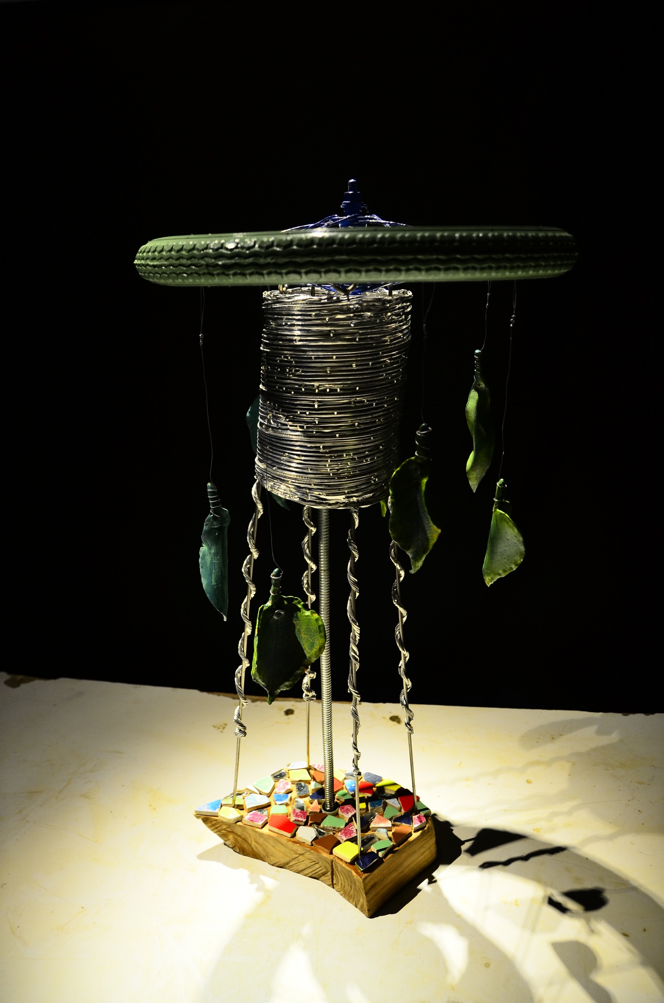 創作理念|做此燈具反映都市人想要親近大自然的夢想,以少許陶板( 葉子) 跟輪胎結合,製作出「樹」的感覺, 而燈罩適用排煙管製作,在上面戳少許小洞,當燈亮時. 會有滿天星空之感。