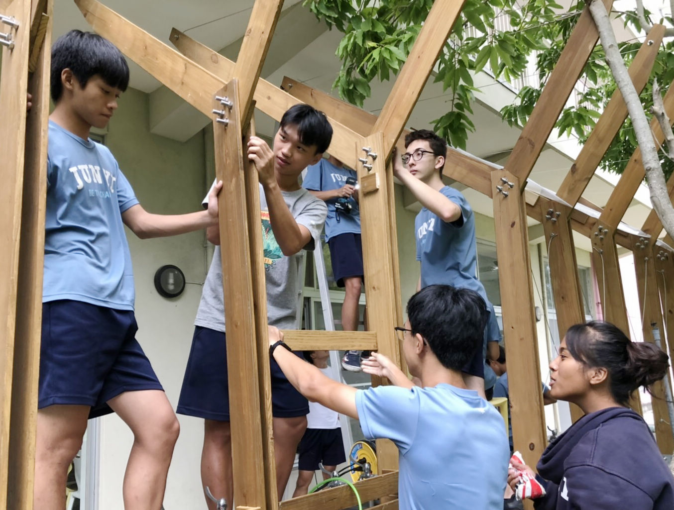 雖然目標不是培養建築師,但沛淳老師仍極力引發學生對建築的興趣,課程大多是以「從無到有」創造的方式進行,老師從不在第一時間提供答案或反對學生的想法,過程中則適時提出意見,這種放手讓學生嘗試的方法,允許每個人提出不同的想法,也讓大家不因為害怕失敗而不敢嘗試。以今年 12 年級這屆學生為例,實作的案子從10年級的全校模型、鳥巢、雞舍, 到 11 年級的音樂劇舞台景片製作、搭建戶外舞台、輔導室隔音工程改裝;流程從業主提出需求、設計建議、環境分析、案例分析、設計提案、施工圖說、到單價分析及預算,在實作當中不斷地面臨新挑戰,也一次次地解決問題。