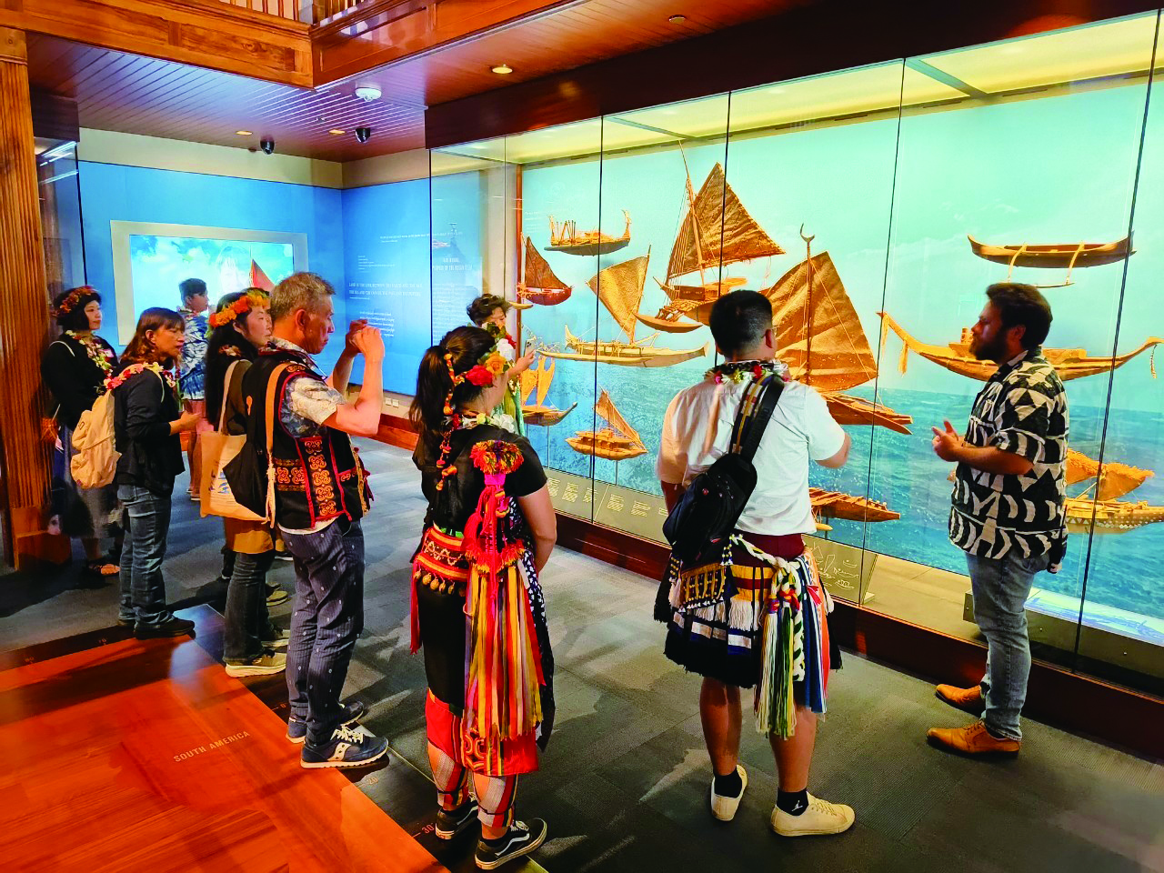 第 9 天,團員踏入夏威夷最大的博物館——畢夏普博物館(Bishop Museum)。在參訪過程中,團員們發現「太平洋廳」所展出的南島古文物中有許多與台灣原住民生活相似的物件,如:排灣族的陶壺、泰雅族的服飾品等,展廳中也展出南島語族的遷徙動線。有一個互動裝置是按下不同的島嶼,會出現該地區對於「手」、「家」、「鳥」等單詞的發音,例如:「船」在東加、庫克群島叫 Vaka,在大溪地、薩摩亞叫做 Va’a,台灣的艋舺則叫 Bangka,發現大海洋諸島上的語言竟然有如此高的相似度,應證了我們都屬於南島語族。